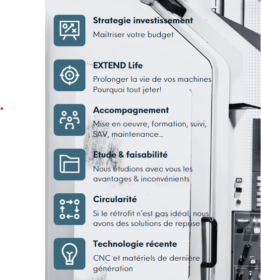 Grâce à nos différents partenaire, nous avons développer un programme nommé EXTEND LIFE. Ce programme est avant tout une mission pour réduire nos déchets et permettre une seconde vie de vos vielles machines outils.